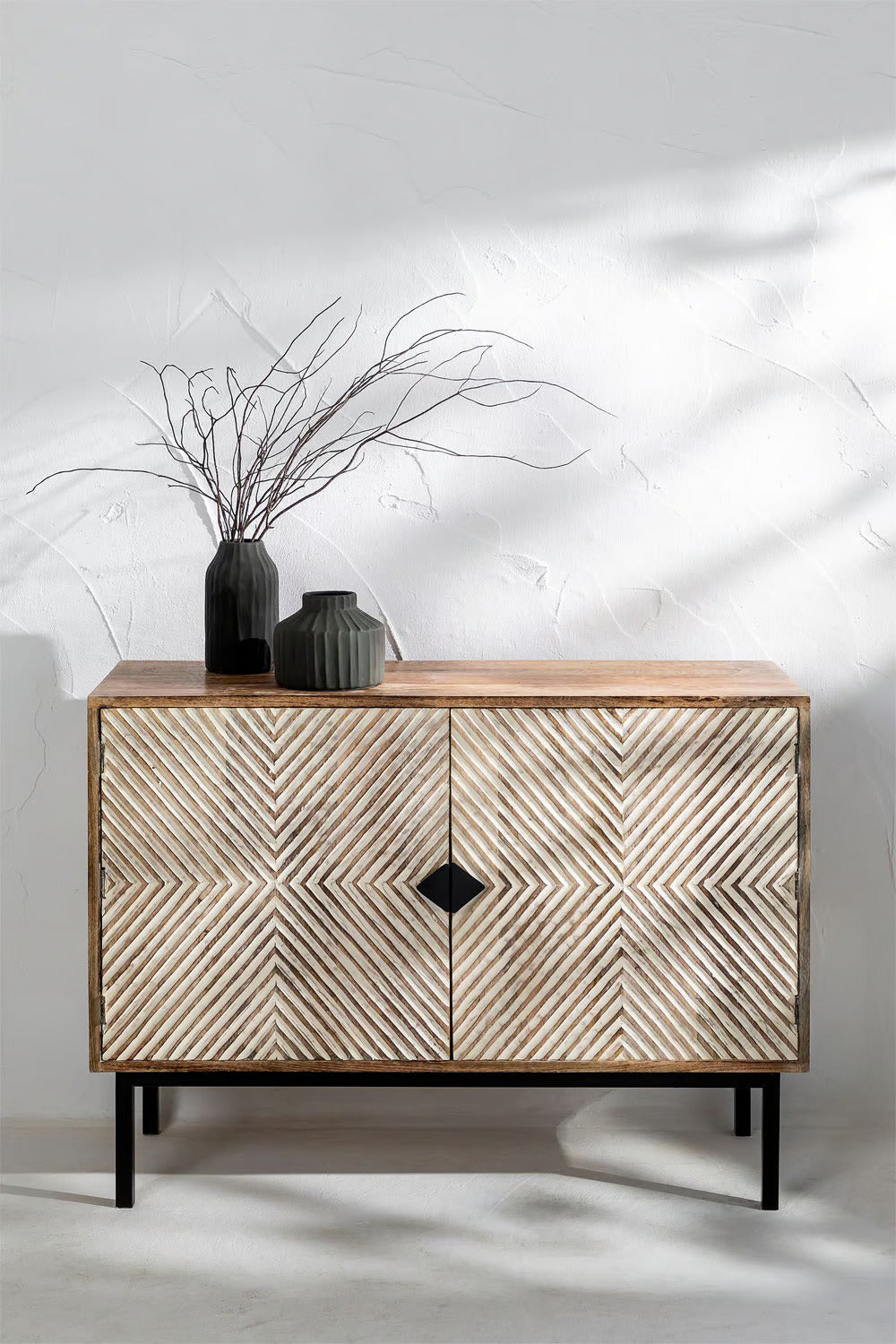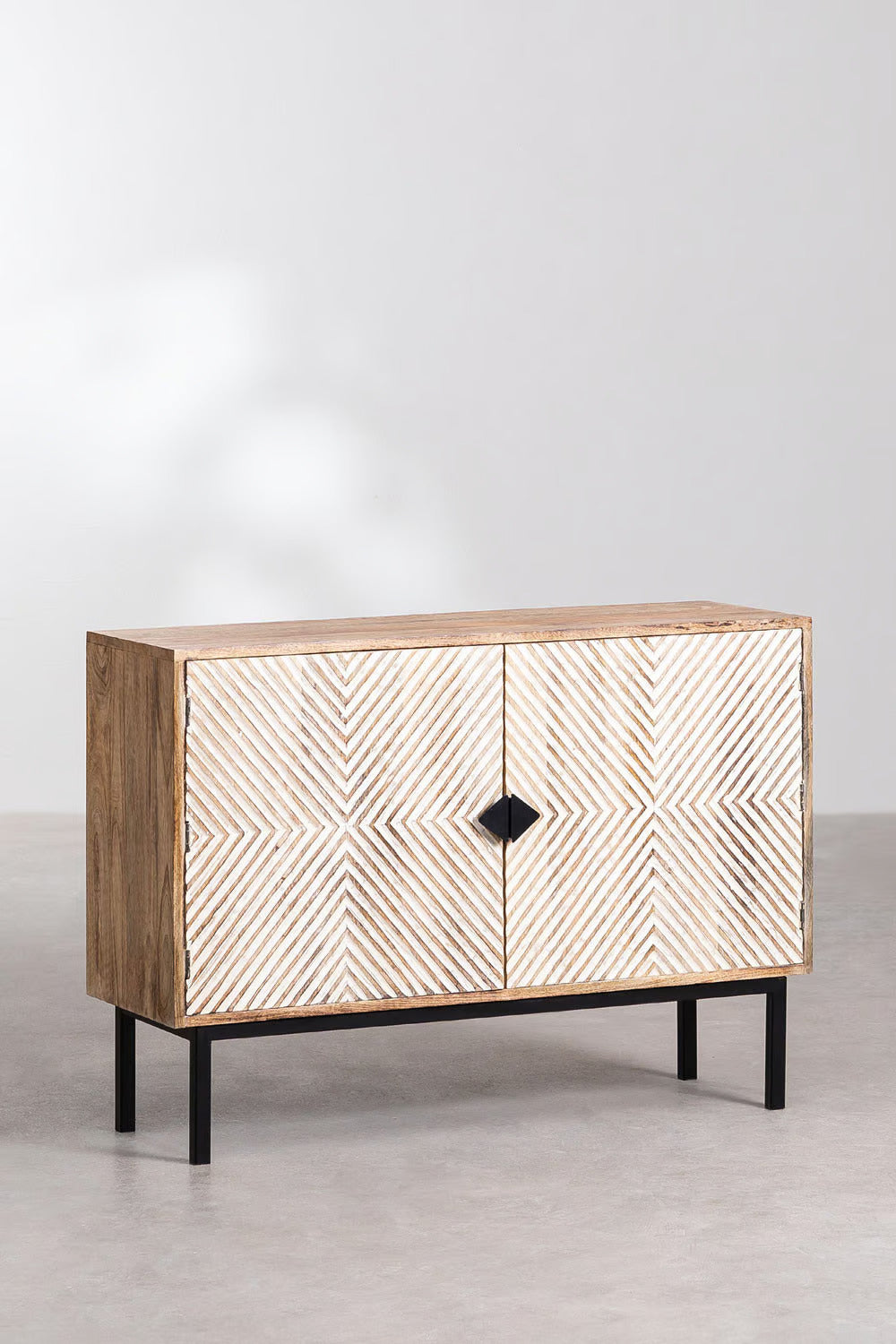 The Alembe Mango Wood Sideboard stands out for its carved wood, which creates a geometric design relief. Get an exclusive look and bring the freshness of the boho style to the room. Its manufacturing combines mango wood in the structure and iron in the legs , materials that make it a robust and durable piece of furniture. The sideboard is ideal for placing in hallways, living rooms or bedrooms.