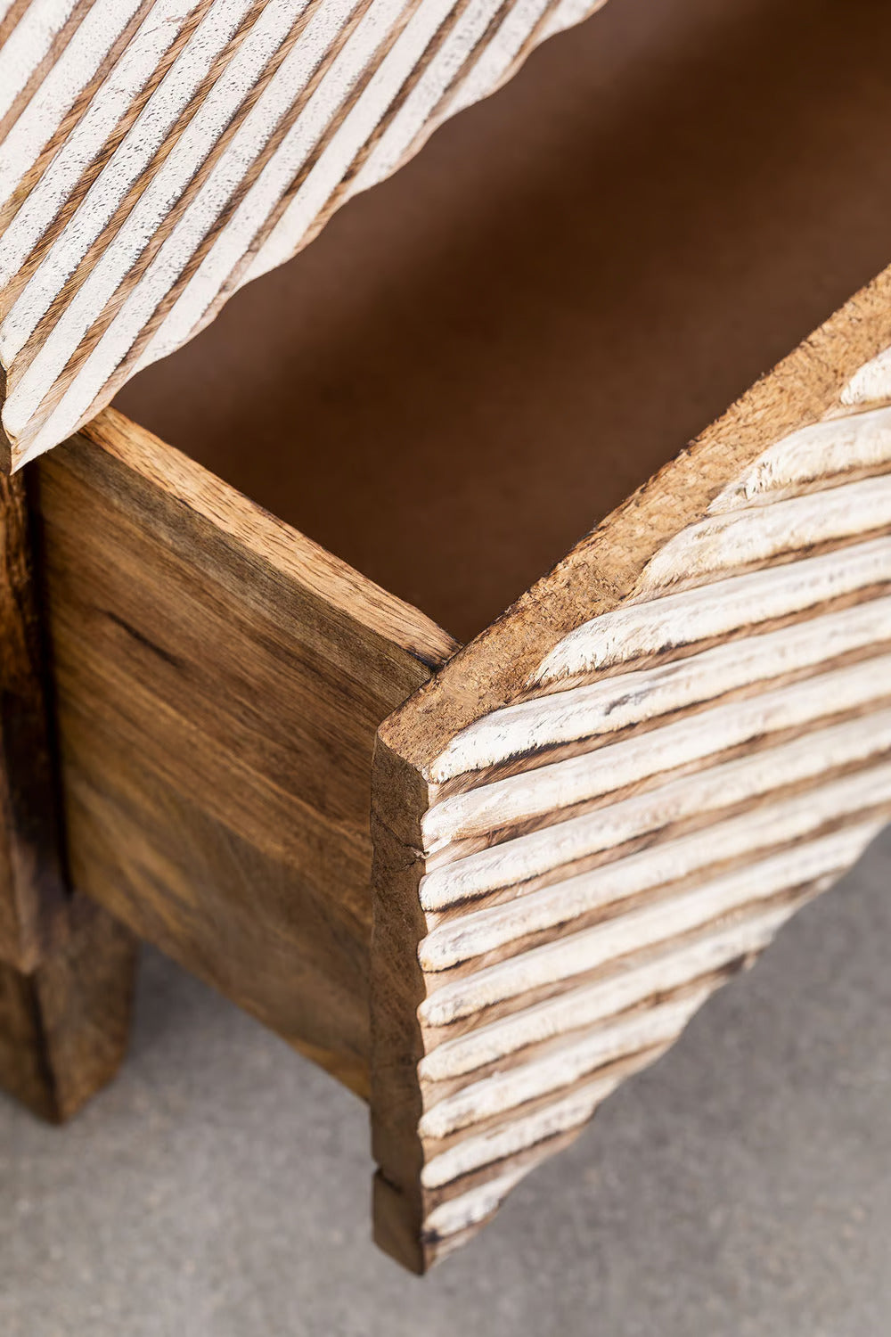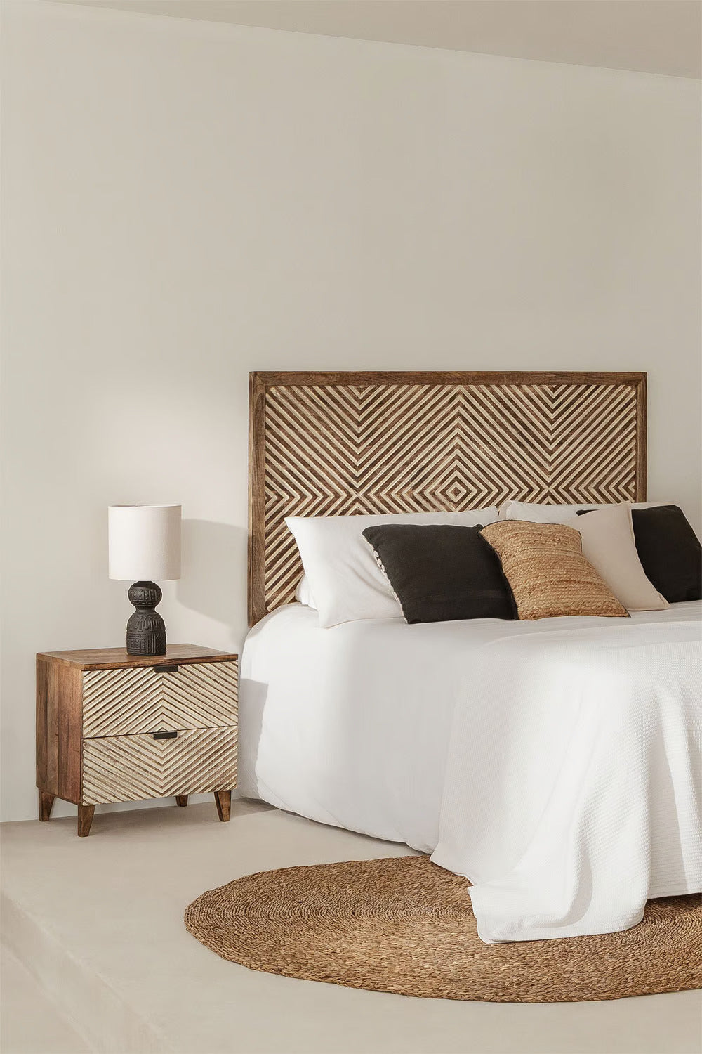 Give an ethnic and bohemian air to your bedroom with the Balary mango wood nightstand . It stands out for its hand-carved wood with a geometric design relief . Balary offers you extra storage space to store your things and keep order in the bedroom. It is made of mango wood and its handles are made of iron , materials that make it a robust and resistant table. In addition, it has a varnish finish, which highlights the details of the wood .