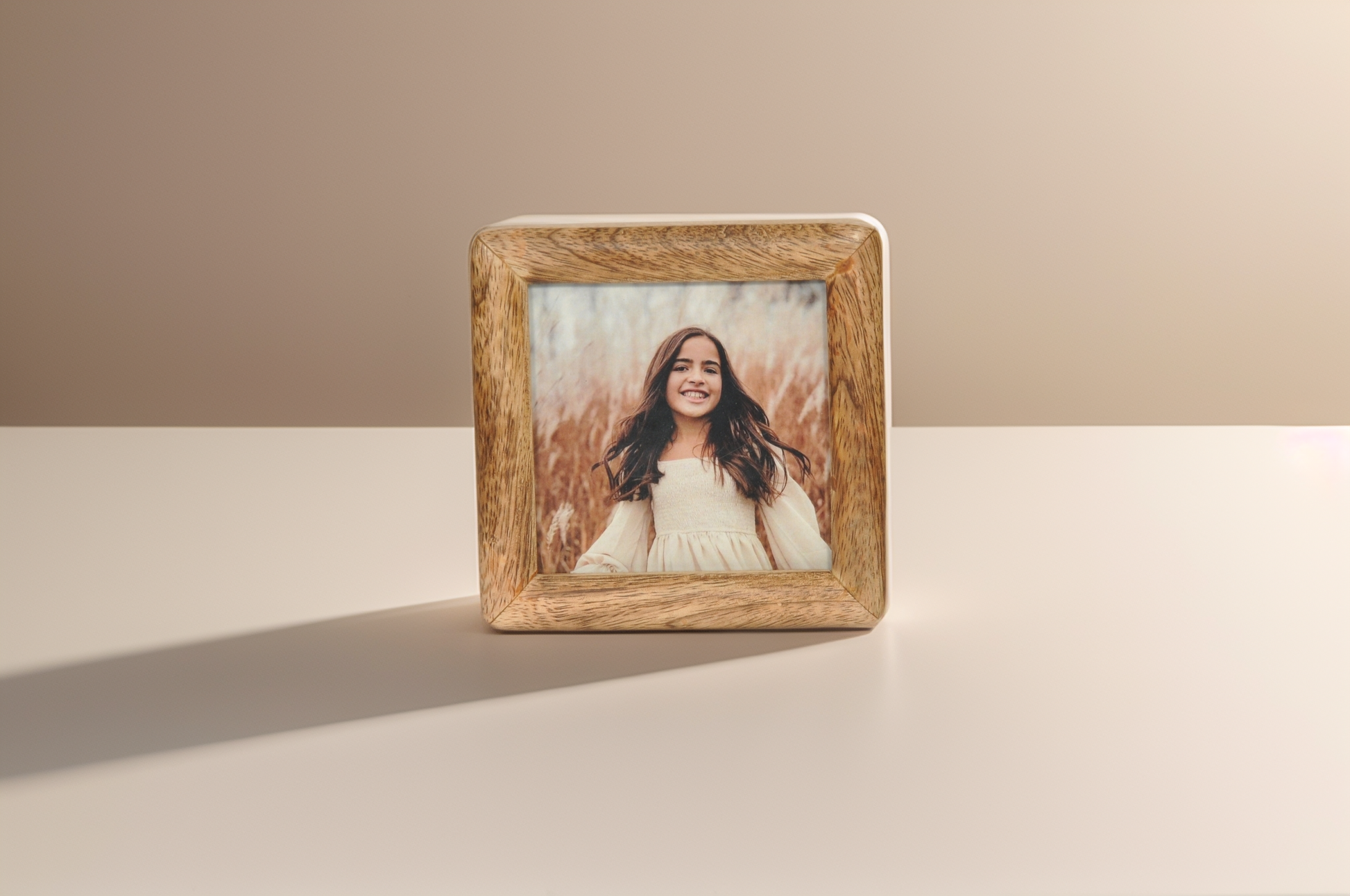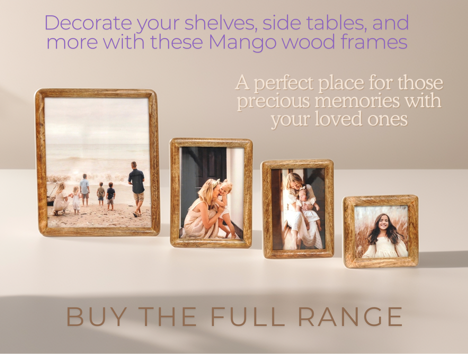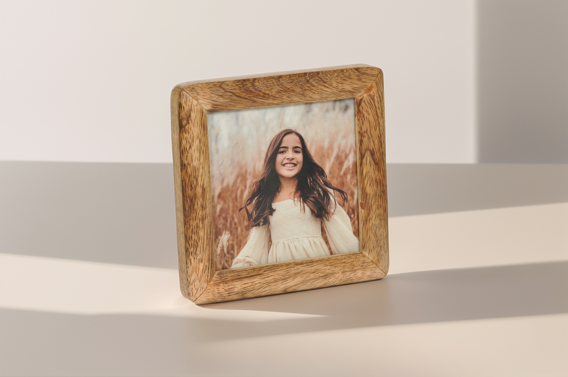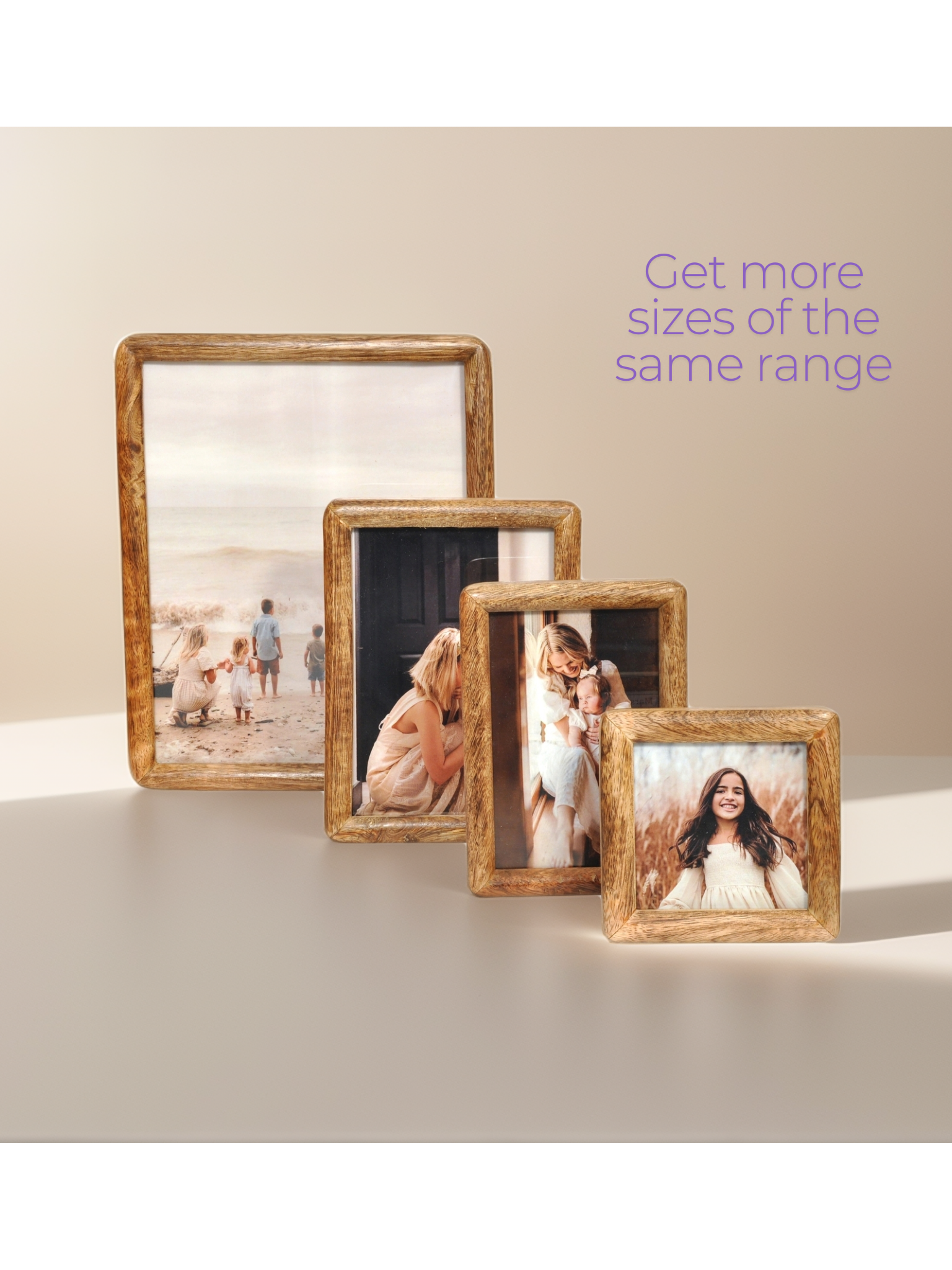Frame your memories with this handcrafted mango wood photo frame. Thanks to its manufacture in mango wood, a very resistant, sustainable and 100% ecological material, and its design of simplicity with its aged color, you will be able to give a natural and vintage air to your rooms. It has a glass to protect the photograph and is perfect for 10x10 cm images. The frame is good to decorate your tables, shelves and bedsides.