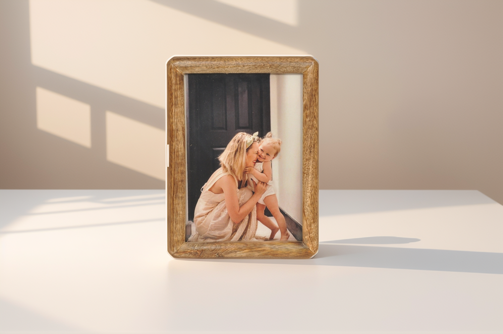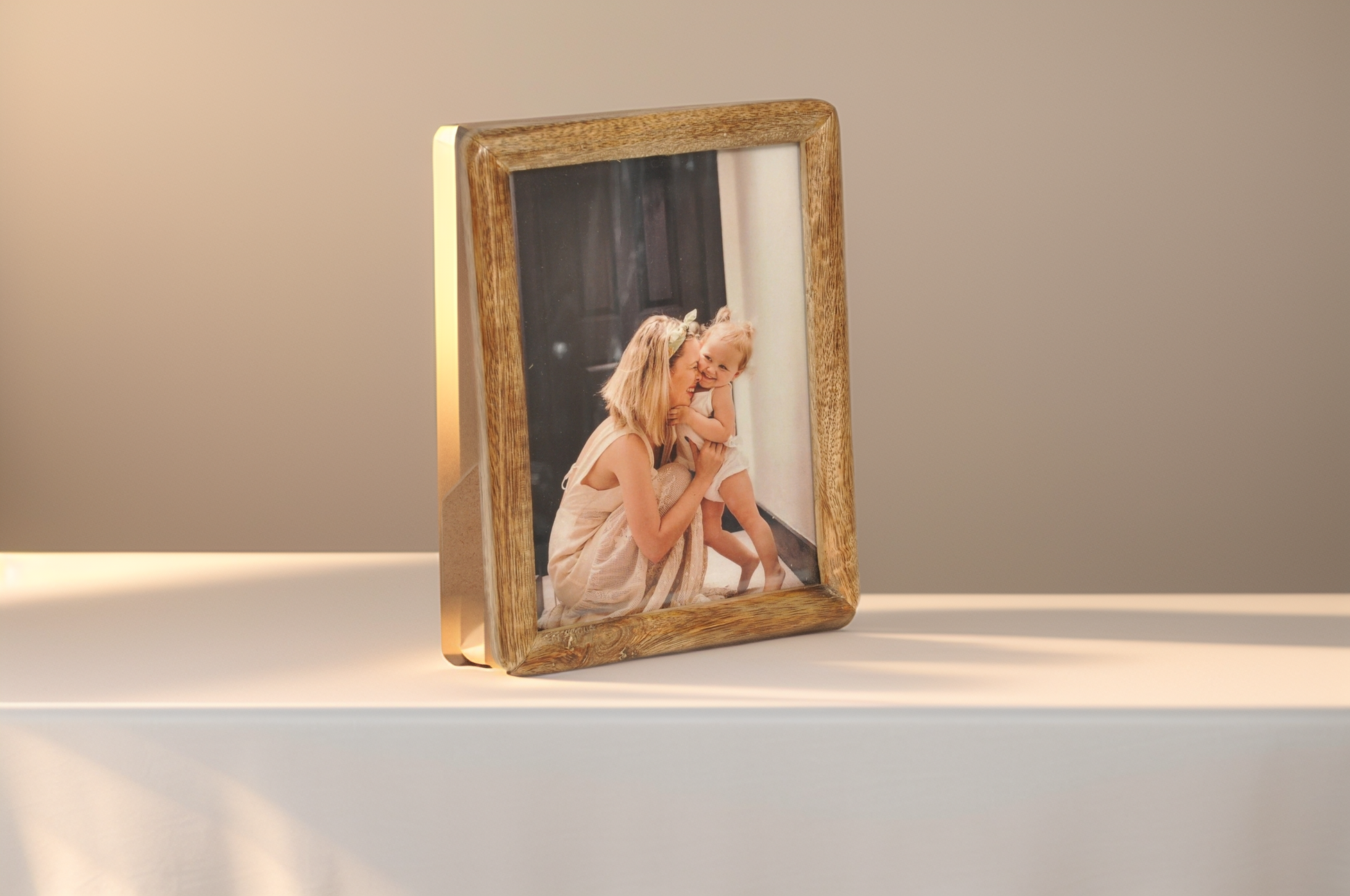 Frame your memories with this handcrafted mango wood photo frame. Thanks to its manufacture in mango wood, a very resistant, sustainable and 100% ecological material, and its design of simplicity with its aged color, you will be able to give a natural and vintage air to your rooms. It has a glass to protect the photograph and is perfect for 13x18 cm images. The frame is good to decorate your tables, shelves and bedsides.