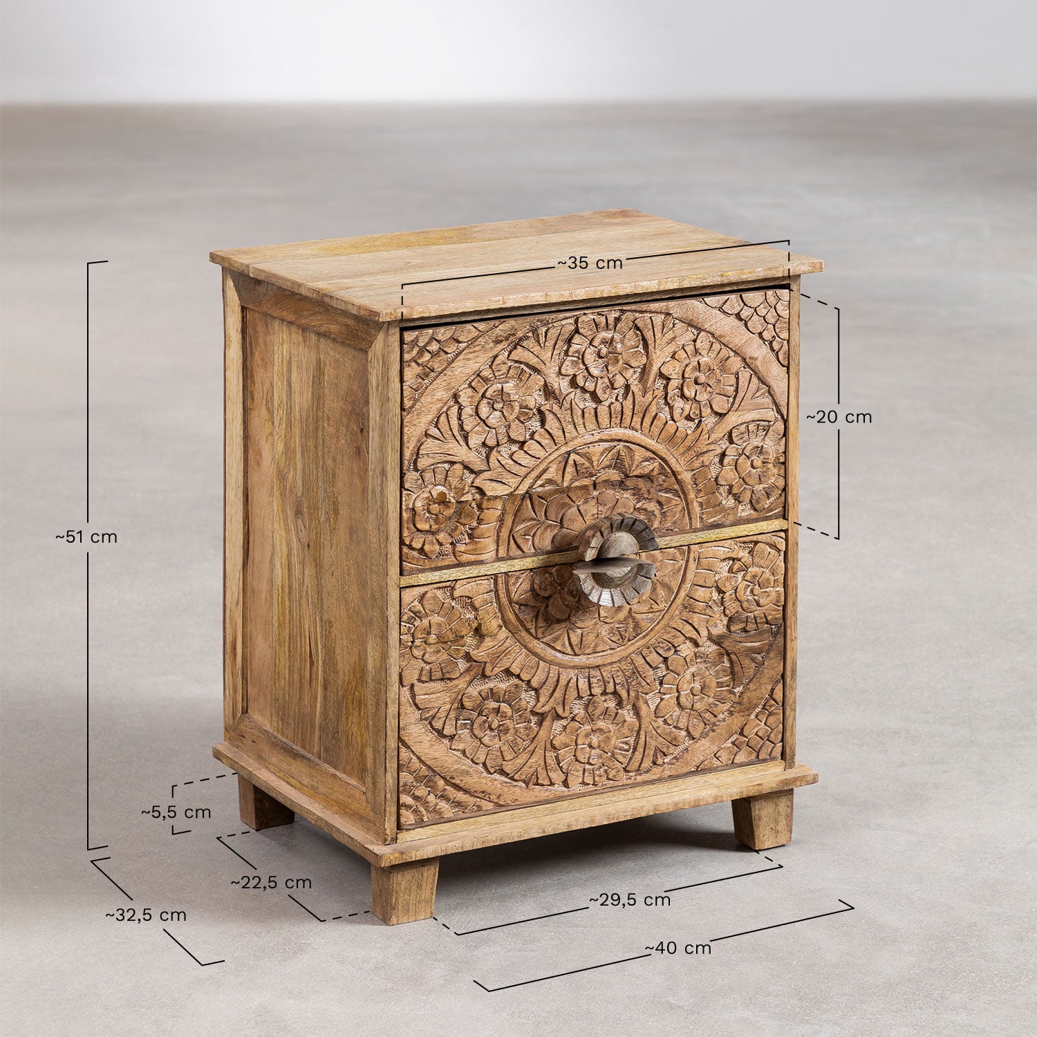 The Wiluna Mango Wood Nightstand with Drawers is going to become a must for your bedroom , a charming piece of furniture that will finally complete the decoration of the room . Made of mango wood , a material that makes it unique, original , as well as resistant and compact . Due to its completely handmade design, this piece may present small variations, so no two are alike. It has two drawers to store your objects and always have them at hand and organized. Boho style , thanks to its finishes you can fit it into any decorative style . Get Wiluna , a piece of furniture that will not disappoint you.
