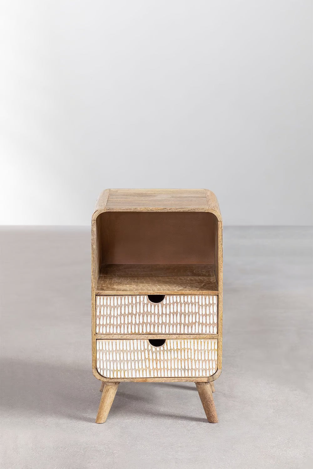 The Yulara mango wood nightstand with storage is going to become a must for your bedroom . Made of mango wood, a material that not only makes it durable and resistant , but also makes it an elegant and sophisticated piece of furniture. It has two perfect drawers to store your daily use items and always have them at hand when you need it most. Let yourself be captivated and get Yulara a nightstand that will not go unnoticed.